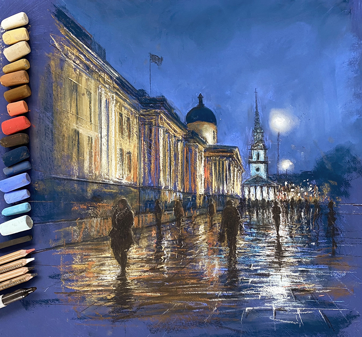 Join us for a live zoom pastel workshop to capture an evening in a beautiful part of London. Looking at painting lights reflecting on the wet pavement, how to draw simple silhouetted figures, and how to simplify perspective.
