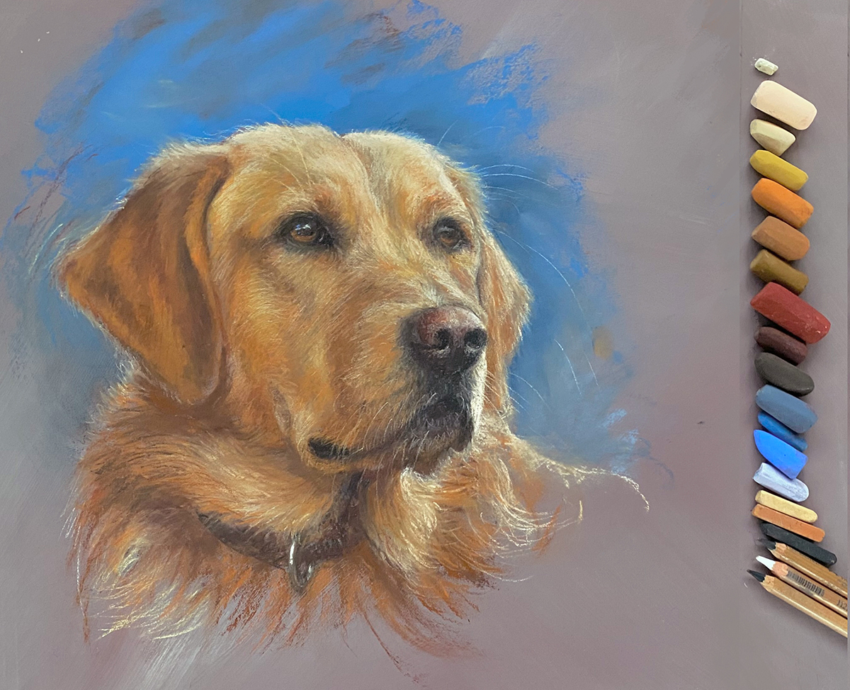 Join us for a live pastel workshop, to sketch a dog’s head in pastels. We will be using charcoal, soft pastels, Conte Sketching Crayons (if you have them) and pastel pencils, to capture the calmness, form and textures of this labrador/retriever cross.